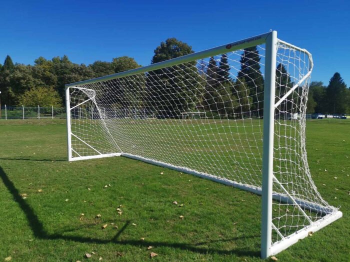 – футболната врата е изработена от овален профил 120х100 мм с канал за кукичките, държащи мрежата – долната рамка е от квадратен алуминиев профил 80х80 мм с канал. – задните профили, опъващи мрежата са от стоманен профил, обработен с цинков грунд против корозия и прахова боя – мрежата не е включена в цената, тя може да се поръча допълнително – футболната врата отговаря на стандарт EN 748