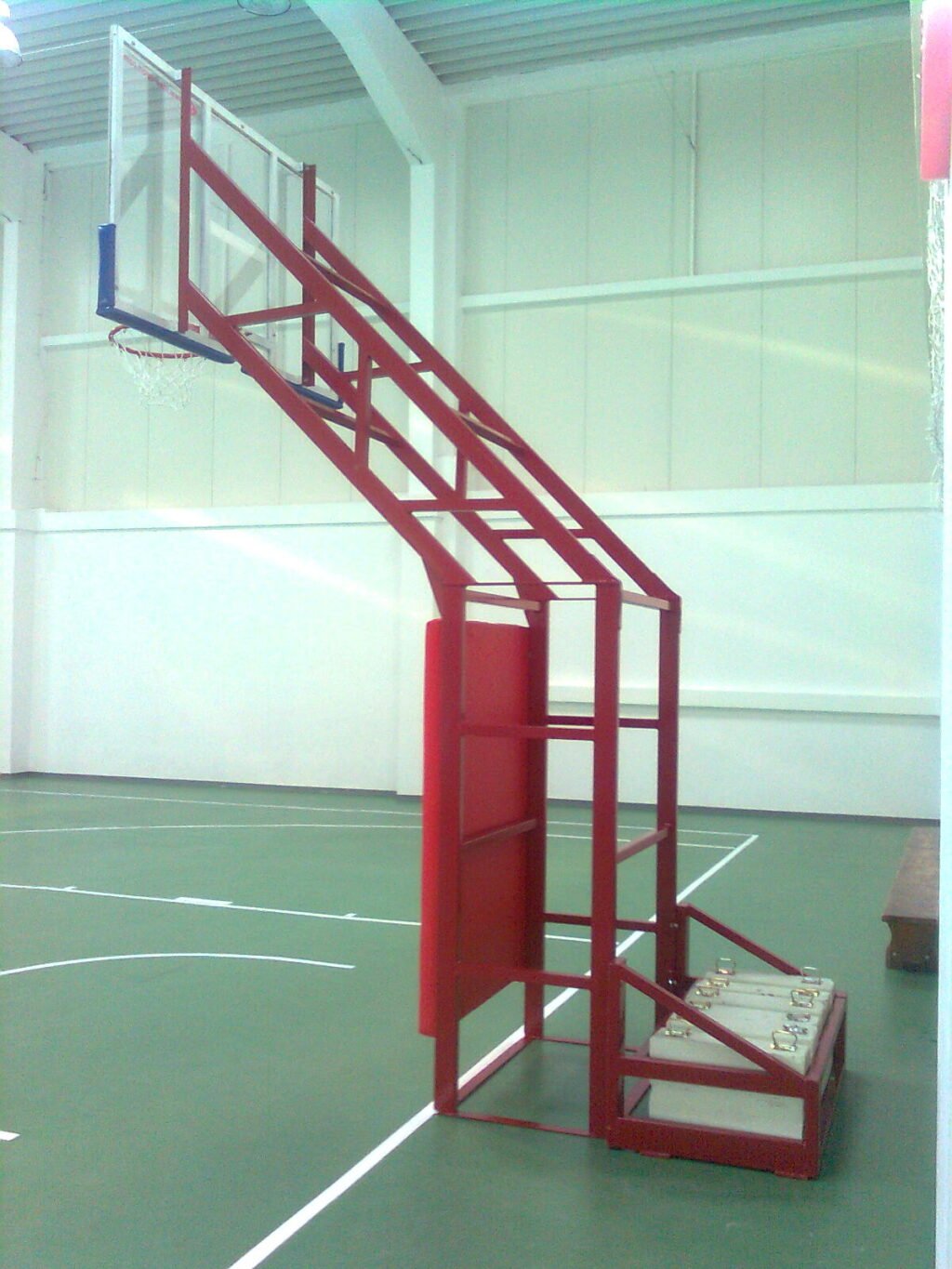 Стойка за баскетбол, решетъчна конструкция. Баскетболна стойка с изключителна здравина, подходяща за училища и спортни площадки. Монтажът се извършва чрез анкериране към здрав бетонен фундамент. Може да се добави и специален стоманен кош с противотежест за по-голяма стабилност когато анкерирането не е достатъчно. Конструкцията е с изнасяне на таблото на 1,25 м навътре в баскетболното игрище. Табло, ринг, мрежа и предпазители не са включени в цената – те могат да се поръчат допълнително.