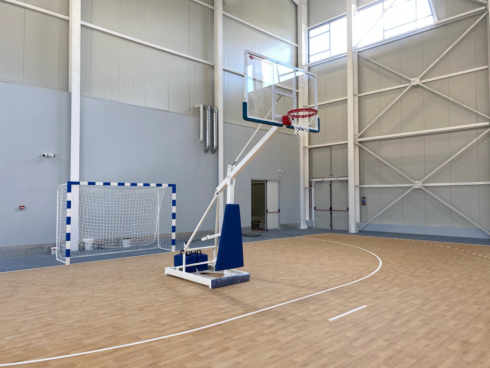 Стойка баскет мобилна за зала – включва стойка с изнасяне на таблото на 125 см от основата, противотежест и предпазители; може да се регулира по височина посредством винтов механизъм; включва плексигласово табло с размери 180х105 см, еластичен ринг с две пружини и мрежа
